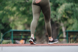 A person in green leggings and black running shoes walking outdoors on a pathway in a park during the day.