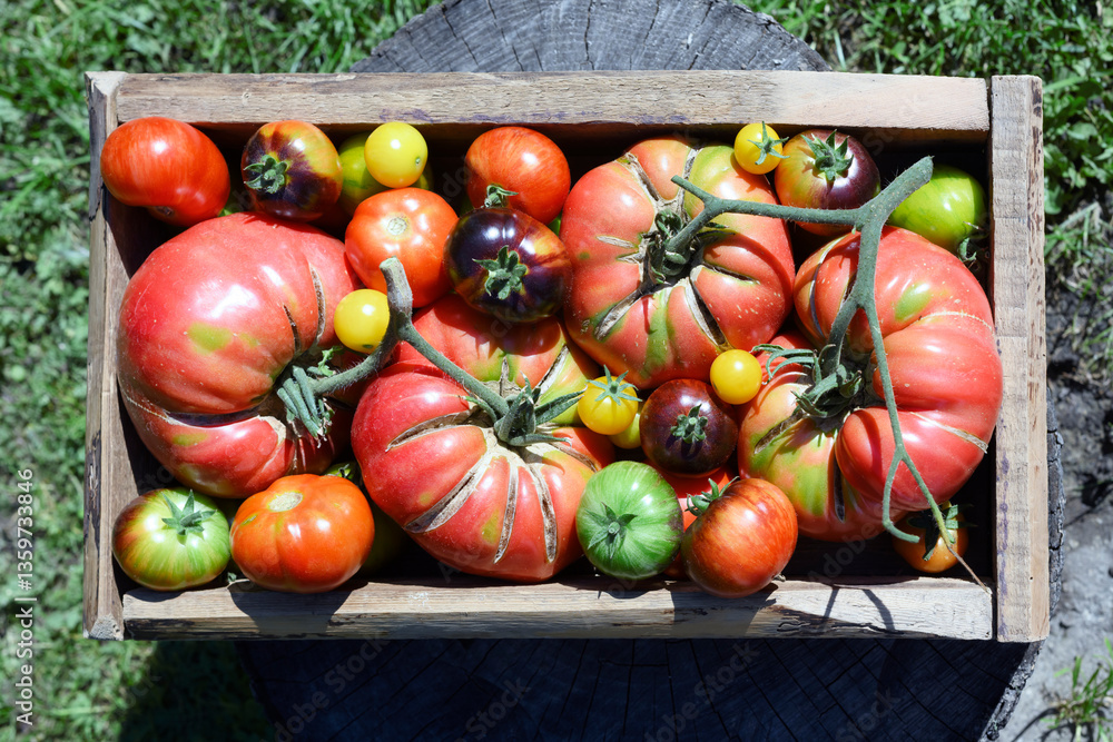 Wooden box filled with different sizes, colors and varieties ripe tomatoes outdoor. Mix of multicolored kind of tomato