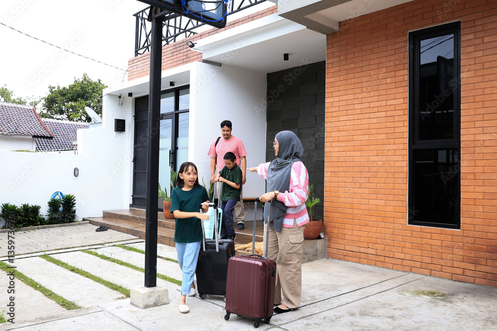 Asian Muslim Family with Kids Going on Mudik Road Trip Back Home During Eid Mubarak Celebration