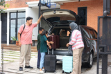Happy Asian Muslim Family Put Suitcases in the Car Trunk Ready for the Mudik Lebaran Road Trip or Pulang Kampung