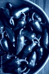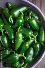 Top view on metal colander filled with green mexican jalapeno hot peppers close up. Food photography