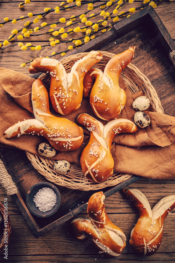 Buns made from yeast dough in a shape of Easter bunny