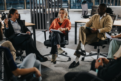 A group of professional colleagues sits in a circle discussing ideas in a corporate setting. The image highlights teamwork, communication, and the collaborative spirit essential for business success.