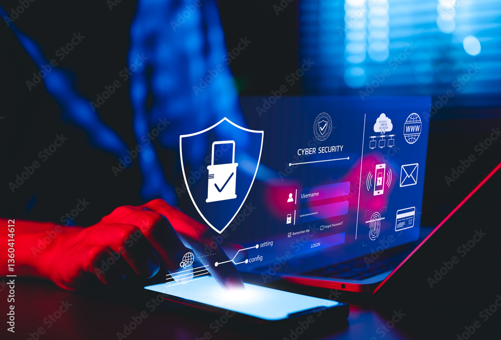 Cybersecurity and Data Protection Concept. A person interact with secure login interface on device, cyber security, data protection, digital identity, screen padlock, and system security technology.