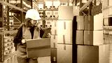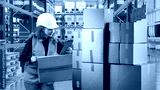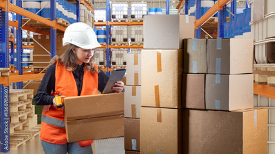 Female warehouse worker in safety gear checks inventory using a tablet while holding a cardboard box, surrounded by stacked parcels and industrial shelving in a large logistics facility