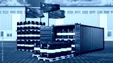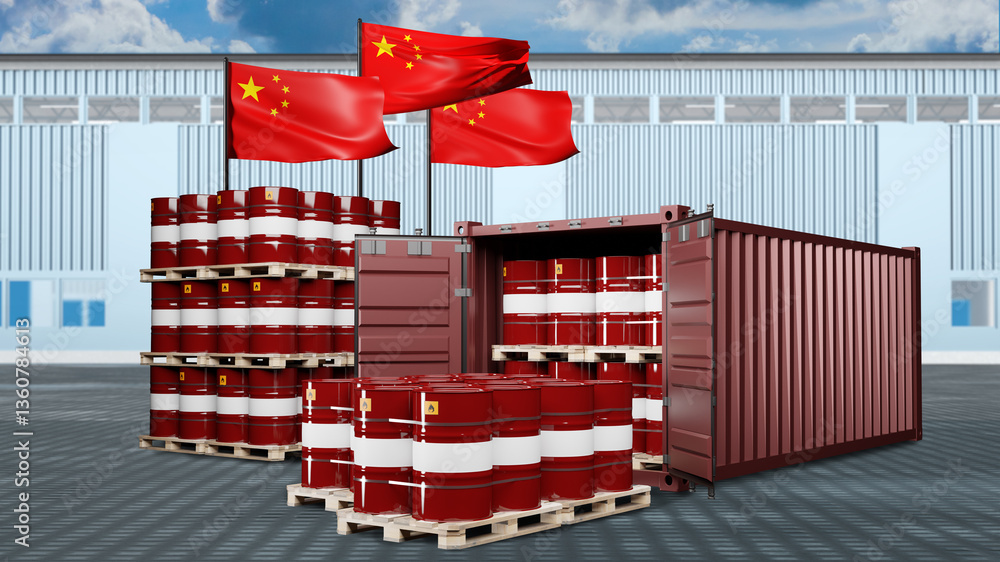 Stacks of red industrial barrels, some inside an open shipping container. Chinese flags. The barrels are marked with flammable warning symbols 3d image