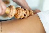 Masseur using wooden tool for maderotherapy massage on woman's body