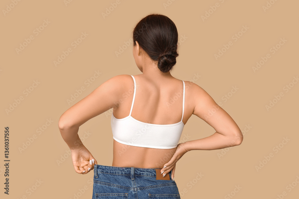 Young woman in loose jeans after weight loss on beige background, back view