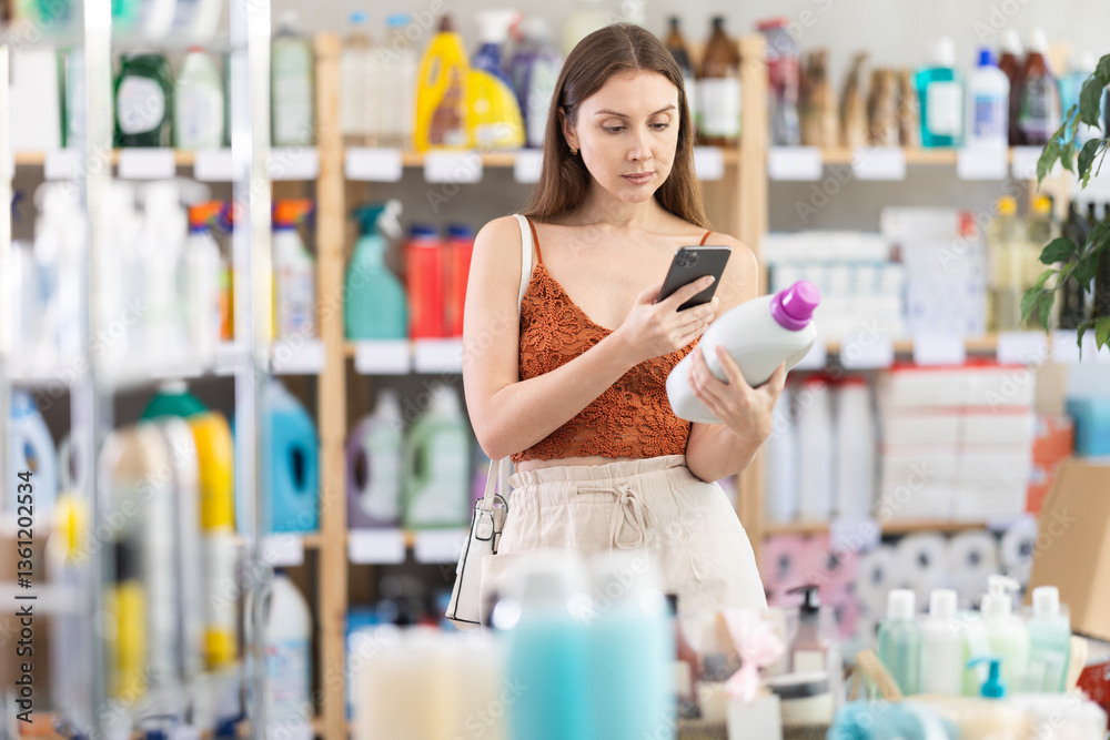 Uncertain young female customer checking QR-code of liquid detergent in supermarket in hot season