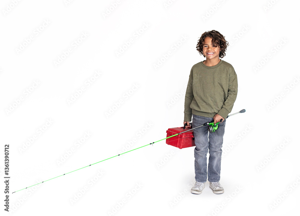 Cute young bi-racial diverse boy walking with his fishing pole and tackle box ready to go fishing. Outdoor recreation and leisure concept photo. Isolated on a white background