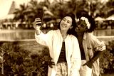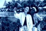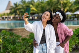 Trendy digital creator couple taking selfie by the beach, sharing travel content for social media