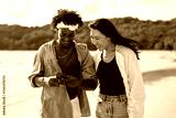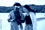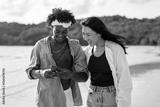 Happy moments by the beach, friends enjoying mobile connection, social media, and summer vibes