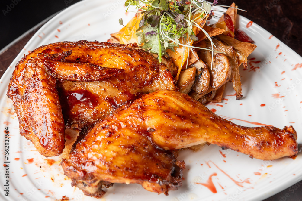 A delicious plate featuring appetizing grilled chicken glazed with a flavorful sauce, accompanied by crispy potato wedges and a colorful salad garnish.
