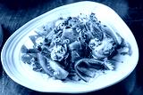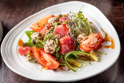 A vibrant, fresh salad featuring a variety of greens, sliced tomatoes, and colorful garnishes, elegantly plated with drizzled dressing.