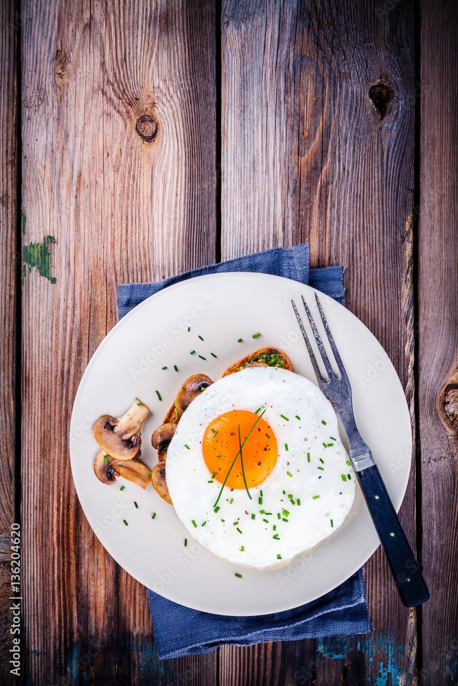 Breakfast: fried egg with mushrooms on toast