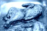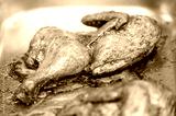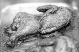 Golden-brown roasted chicken sizzling in a metal tray, showcasing a crispy texture and rich flavor, perfect for a delicious meal or appetizer