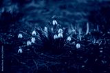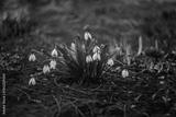 A natural close-up photograph of blooming snowdrops growing from the soil in an early spring garden. The flowers stand out against a soft earthy background, symbolizing the first signs of spring.