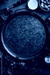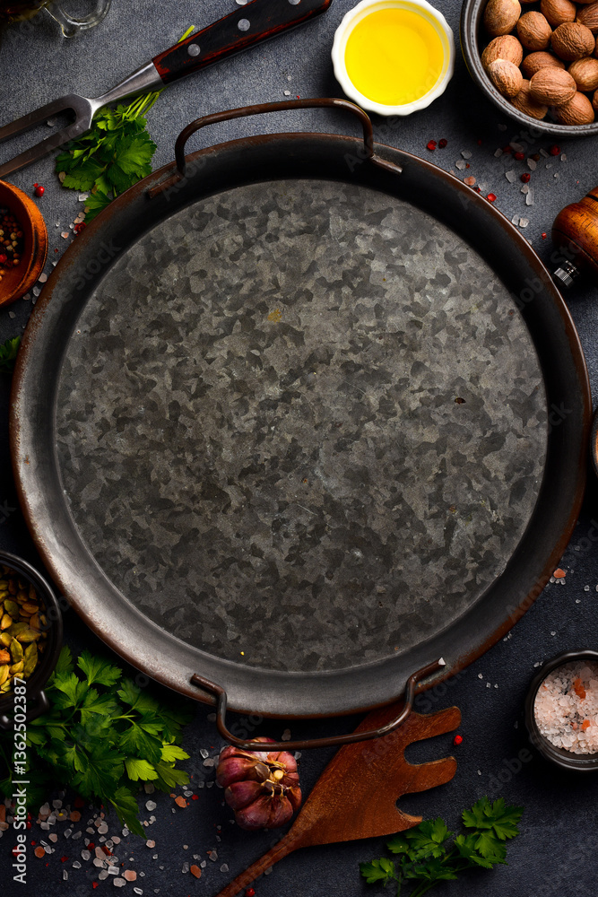 Black food background. Vegetables and spices on black background. Top view. Free space for your text.