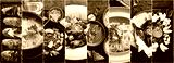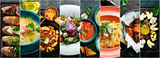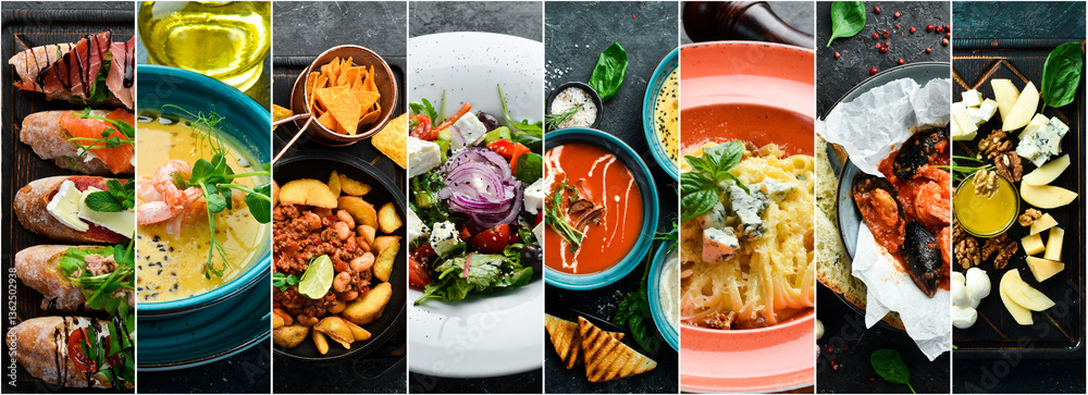 Background of food and dishes of European cuisine. on a dark stone background. Photo collage, banner from photos.
