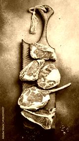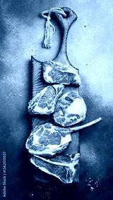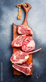 Black Angus prime steak set on a wooden board: Tomahawk, Ribeye, T-bone and Ossobuco steak. Top view.