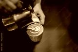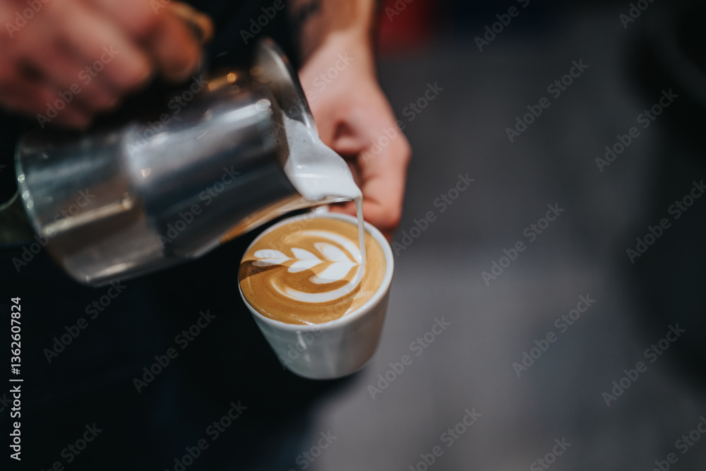 A barista pours steamed milk into a coffee cup, creating intricate latte art. The scene highlights craftsmanship in coffee preparation, focusing on creativity, and the delicacy of coffee culture.