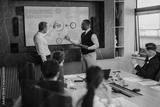A diverse group of business people engage in a meeting, discussing strategies and data displayed on a large screen in a modern office setting.