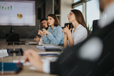 A multicultural group of business people engaged in a collaborative meeting. The team is focused, exchanging ideas, and planning strategies, highlighting teamwork and multicultural collaboration in a