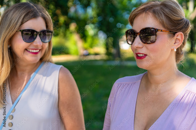 Summer in city. Two beautiful middle aged women enjoying walk in city park on beautiful sunny day. Front view