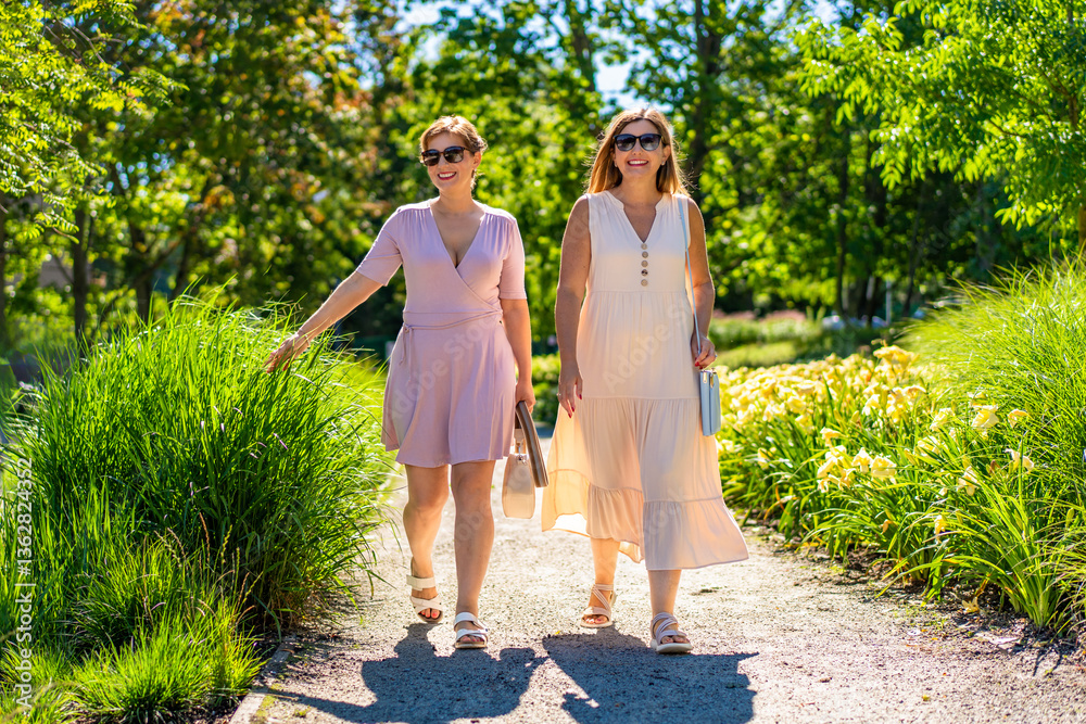 Summer in city. Two beautiful middle aged women enjoying walk in city park on beautiful sunny day. Front view