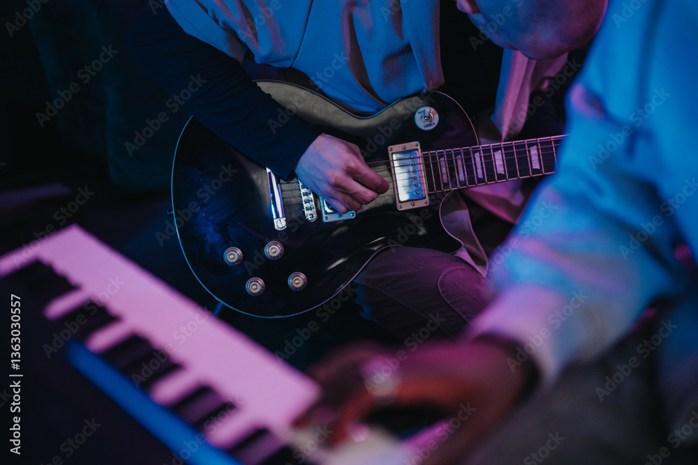 A group of talented musicians collaborate in a studio setting, crafting melodies and harmonies. The scene captures the creativity and diversity within a dynamic music production session.