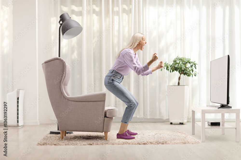Full length profile shot of an ecstatic woman gesturing with hands in front of tv
