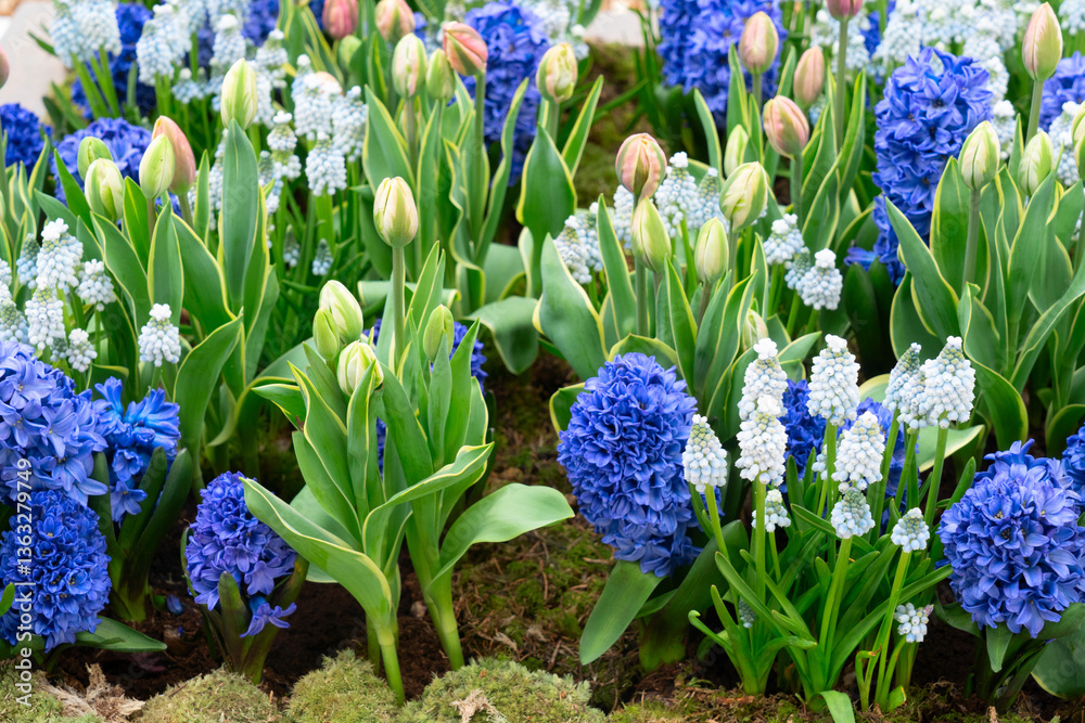 A Beautiful and Vibrant Spring Flower Arrangement Showcasing Lovely Tulips, Daffodils, Hyacinths, and Muscari Blooms