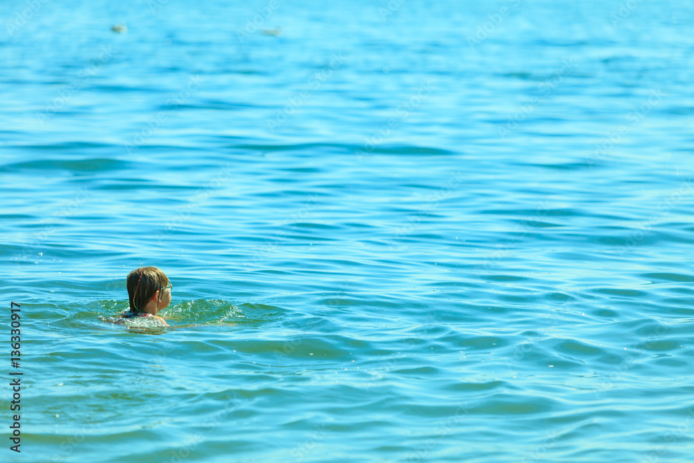 Little girl kid swimming in sea water. Fun
