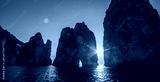 Sunlight glowing behind majestic, tall rocks in ocean of Italy - wide shot