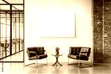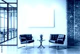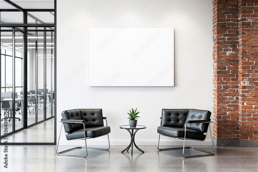 Empty white canvas on a light wall in a modern office lounge withchairs, a small table, and a brick accent. Perfect for branding or advertising. Ai generative