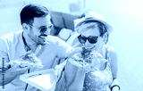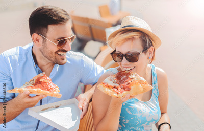 Couple eating pizza outdoors. Dating, relationships, food, lifes