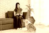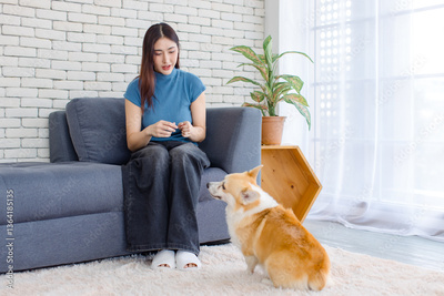 Portrait of asian young beautiful woman happy smile sitting on sofa giving puppy treats cute welsh corgi dog, while playing funny animals in living room at home concept lifestyle enjoy love pet friend