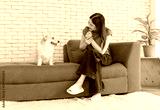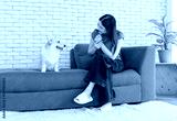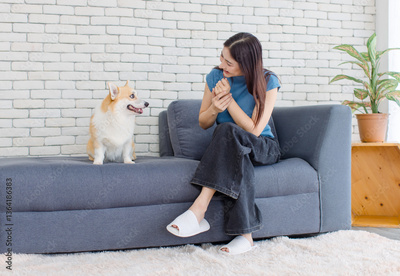 Portrait of asian young beautiful woman happy smile looking at cute welsh corgi dog sitting on sofa playing funny animals in living room at home concept embracing lifestyle enjoy trust love pet friend