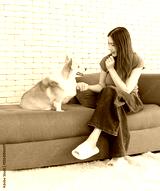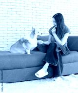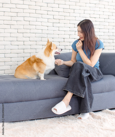 Portrait of asian young beautiful woman happy smile look into eyes cute welsh corgi dog sitting on sofa playing animals in living room at home, concept embracing lifestyle enjoy trust love pet friend.