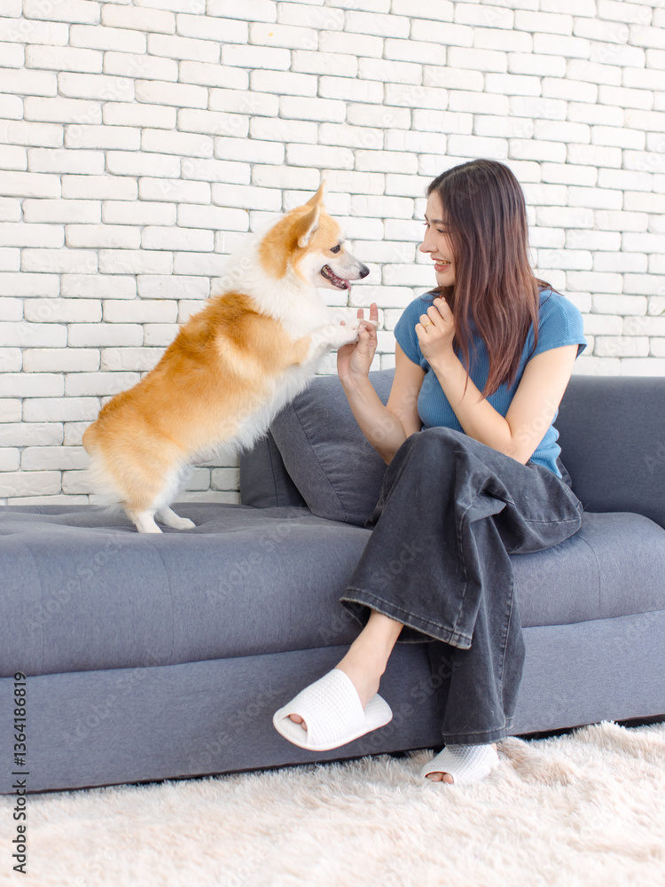 Portrait of asian young beautiful woman happy smile look into eyes cute welsh corgi dog sitting on sofa playing animals in living room at home, concept embracing lifestyle enjoy trust love pet friend.