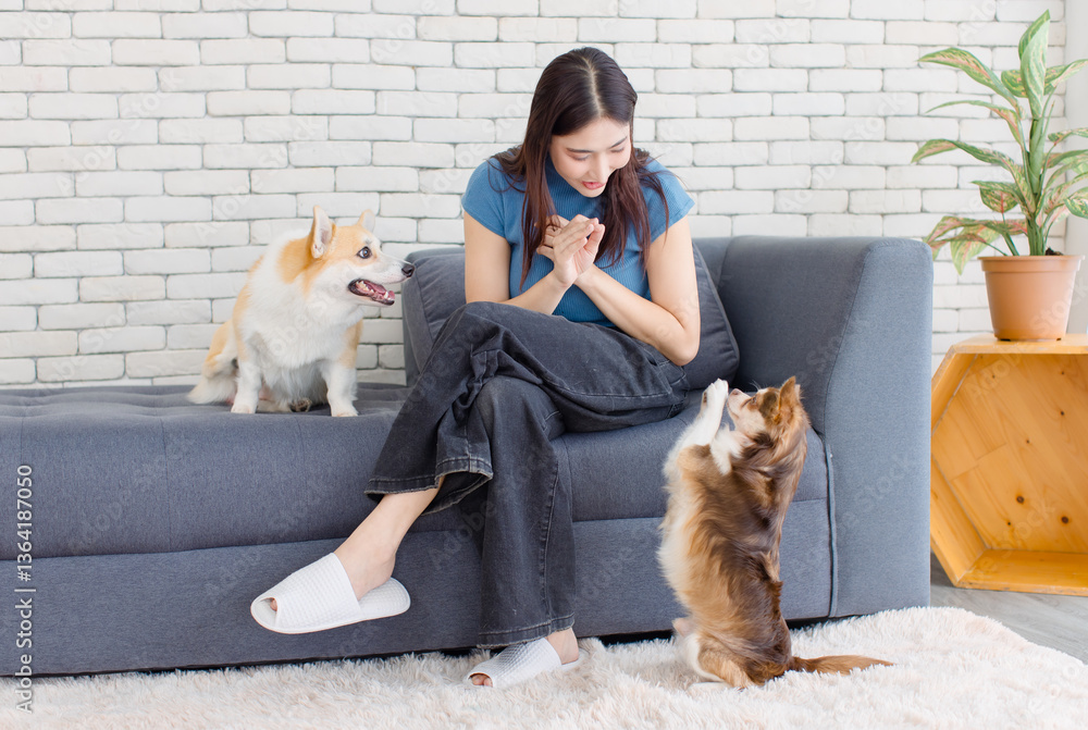 Portrait of asian young beautiful woman happy smile sitting on sofa giving treats snack to cute welsh corgi dog and chihuahua dog playing animals in living room concept lifestyle enjoy love pet friend