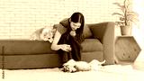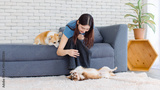 Portrait of young asian beautiful woman happy smile sitting on sofa playing cute welsh corgi dog and chihuahua dog animals on the floor in living room concept embracing lifestyle enjoy love pet friend