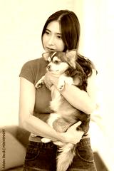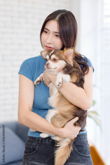 Photo of asian young beautiful woman happy smile tender cuddling little chihuahua cute puppy dog while holding hugging playing animals in arms in living room at home concept enjoy time love pet friend