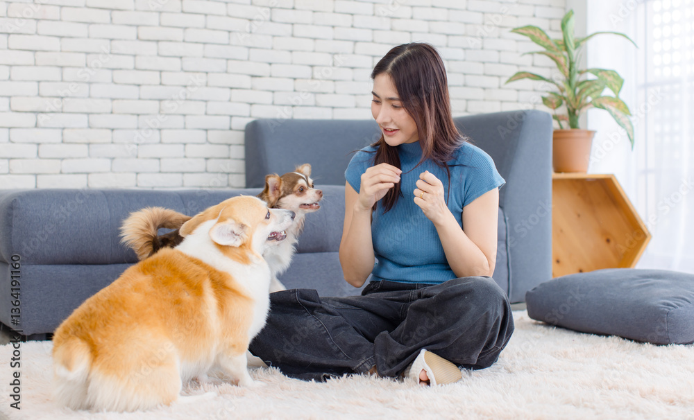 Portrait of asian young beautiful woman happy smile sitting on carpet floor playing cute welsh corgi and chihuahua dog in living room at home concept friendship animals lifestyle enjoy love pet friend