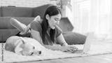 Asian young beautiful woman happy smile with cute welsh corgi dog lying on carpet floor using laptop computer in living room at home concept working with best friend animals lifestyle balance love pet
