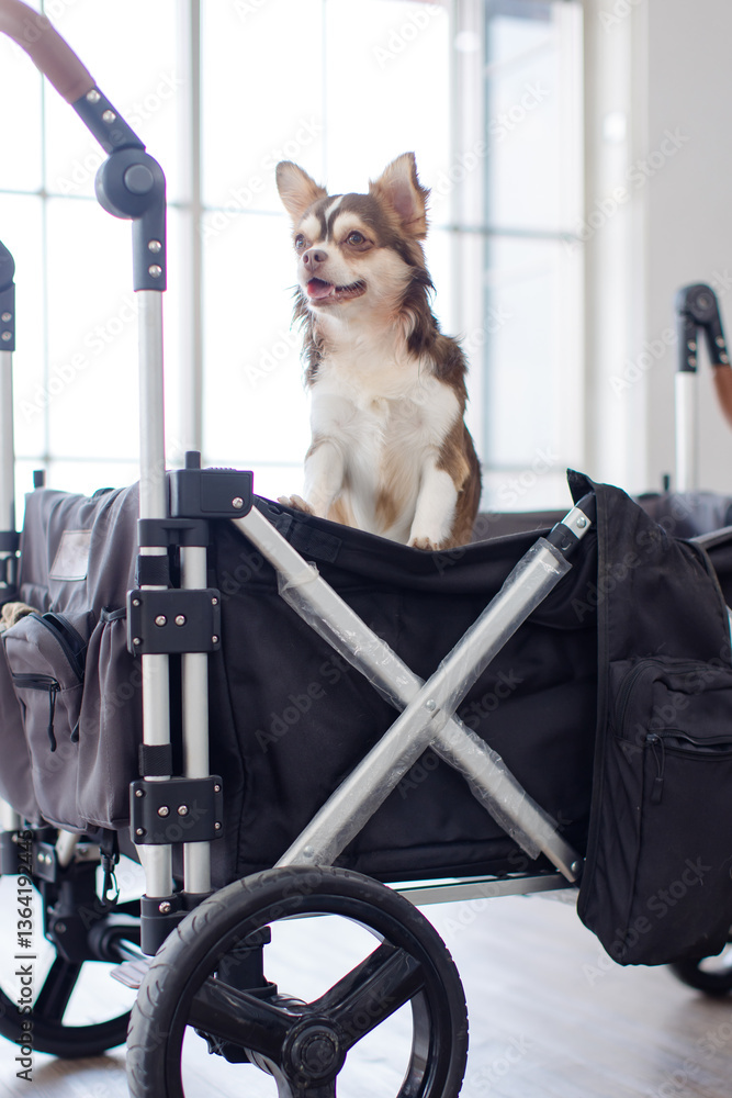 Photo closeup of cute brown long hair chihuahua dog standing sit in comfortable pet stroller looking at owner in living at home preparing to travel concept training relationship animal love friendly.