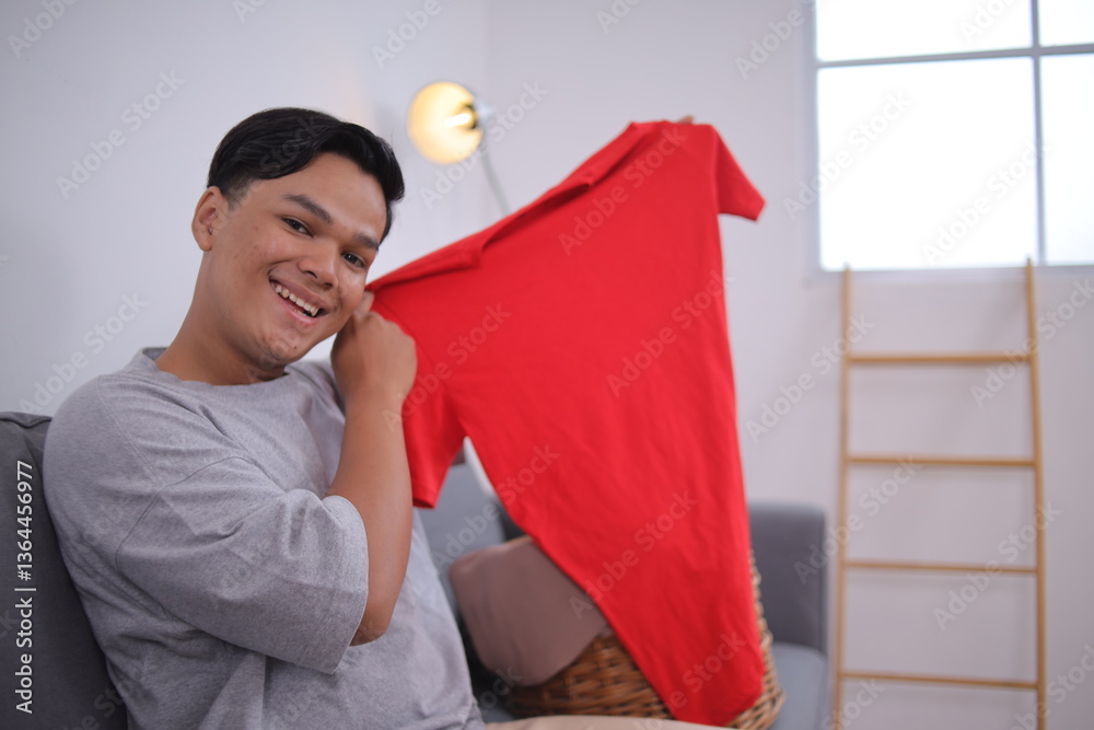 Portrait Of Young Asian Man Showing Clean Clothes At Living Room