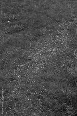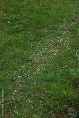 Close-up od many hailstones on green meadow. Hailstorm in the garden on springtime
