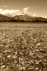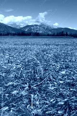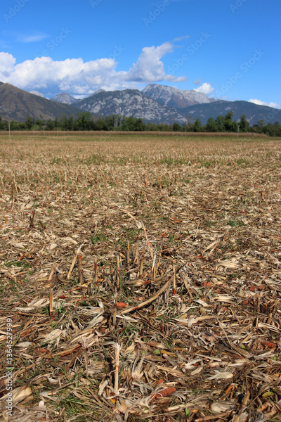 Harvested corn field with cut plants and red cron cobs on a sunny autumn day against blue sky