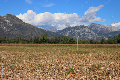 Harvested corn field with cut plants and red cron cobs on a sunny autumn day against blue sky